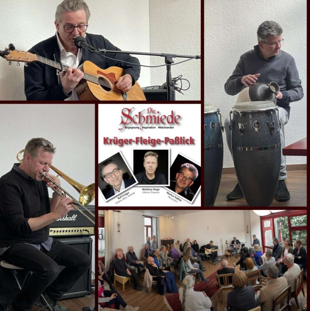 Und das Schmiede-Team (Ela und Karin) freut sich erneut auf einen schwungvollen Start im Neuen Jahr mit Rolf Krüger, Matthias Fleige und Markus Paßlick. Gitarren, Posaune, Percussion und Gesang helfen dem Trio an dem Sonntagmittag mit ansteckenden Rhythmen für gute Stimmung zu sorgen. Sowas von…2026 kann kommen!